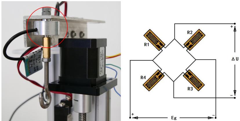 图 3 拉力传感器(左)、应变片电桥(右)