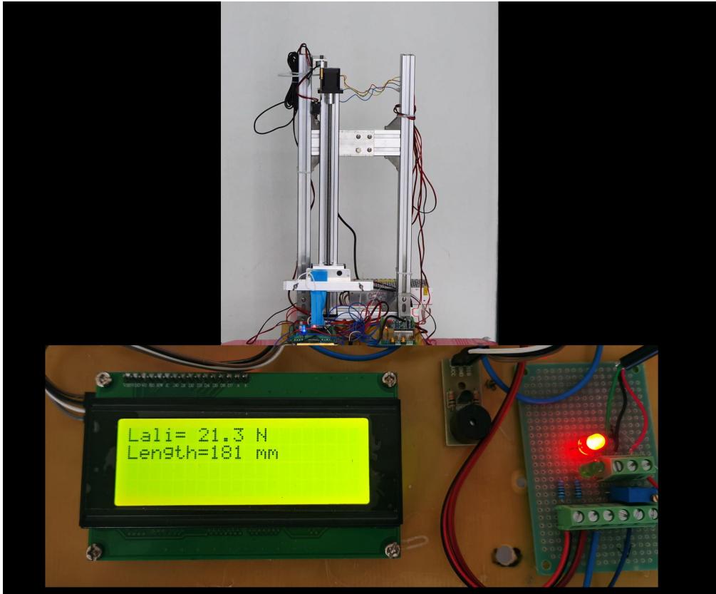 按动 10N 测试启动按钮,电机转动带动滑台匀速向下移动,当拉力等于 10N时停止,并计算拉伸长度,一并显示(见下图);