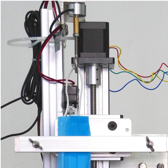 在检测口罩之前,启动电机向上运动,滑台回到最上面触发上限位开关,此时已经回到零位,电机停转,用夹具夹紧口罩罩体,挂绳的一端自然挂在拉力传感器下方铁钩上,(见下图);