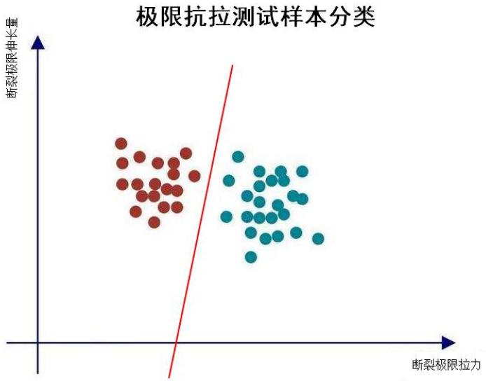 本实验特色之一,体现在数据样本方面,为了适应新工科面向新技术面向未来的要求,在本实验中引入机器学习的内容样本分类。实验中可以对断裂极限的拉力和伸长量进行多次测量,形成样本空间,利用一元函数进行样本分类,实验中将对 2 种口罩进行测试,每种口罩不少于20 个样本。学生须通过 Python 语言进行编程,对采集到的断裂极限样本进行分类,并计算出分类的线性函数。分类的示意图如下: