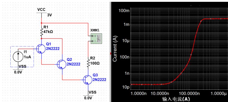 由于一个三极管的放大倍数不满足实验的需求,本电路中采用了达林顿管的接法,将三个三极管级联,从而可以使电路的放大倍数为三个三极管放大倍数相乘,达到 $1 0 ^ { 6 }$ 程度的放大作用。以下为实际电路的仿真,从右边的输入输出图像中我们可以看到,该电路可以将 $n A$ 级别的感应电流放大到级别。