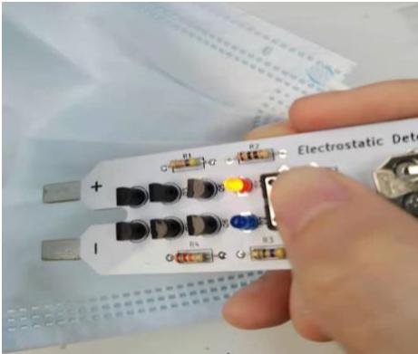 在检测口罩时,需要将探测器在靠近口罩的地方来回移动,此时 LED 将开始闪烁,且靠近带静电物体和远离带静电物体时闪烁的小灯颜色不同;LED的峰值亮度越大,说明探测到的静电场越强。当 LED的亮度显著降低,说明静电场明显减弱,此时口罩可判断为无效口罩。