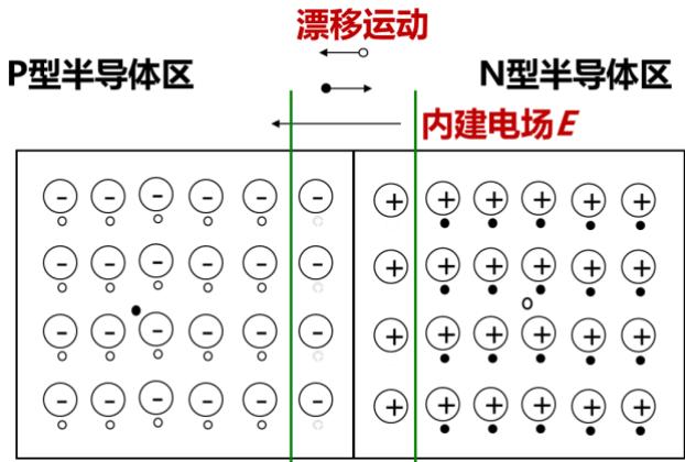 N 型半导体是在硅中掺入 $^ { + 5 }$ 价的磷原子,由于磷为 5 价,其中有 4 个电子和周围 4 个硅原子形成共价键,还剩有 1 个电子由于不受共价键束缚可以自由移动。P 型半导体是在硅中掺入 $^ { + 3 }$ 价的硼原子,硼的 3个电子和周围 4 个硅原子形成共价键,还有一个硅原子形成共价键,会出现一个空穴。当把 P型半导体和 N型半导体结合在一起后,虽然原子受共价键作用不能移动,但是空穴和自由电子是可以移动的。由于 P型半导体和 N型半导体中电子和空穴的浓度不同,这些载流子会在浓度差下产生扩散运动,在 P型半导体和 N 型半导体的接触面附近,电子和空穴相互复合消失。在接触面附近,失去电子和空穴的原子变成了带电离子,但由于共价键束缚不可移动,便形成了一个内部电场。这个内电场形成后,载流子在电场力的作用下做漂移运动,反过来又阻止扩散运动。最后这两种运动会达到一个动态的平衡,形成一个空间电荷区,这就是 PN结的形成过程。