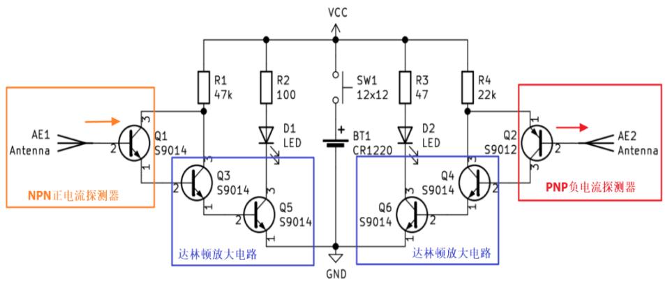 实际电路如图所示。所用器件有:天线 AE1 和AE2,三极管 $\mathrm { Q 1 { \sim } Q 6 }$ ,电阻 ${ \tt R } 2 \mathrm { \sim } { \tt R } 5$ ,发光二极管D1 和 D2,电源和开关。其中 R2和 R5 电阻给电路偏置,使三极管工作在放大状态。R3 和 R4 电阻用来保护发光二极管。