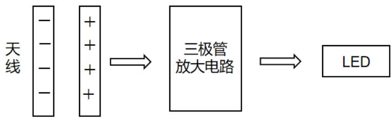 综上所述,我们电路设计思路如下图所示。首先通过探测天线感应外部电荷的运动电场变化,产生感应电流。由于感应电流的大小为 级别,非常微弱,需要经过三极管电路放大之后达到 级别才可以点亮 LED。值得注意的是,该电路是通过感应电场变化的方式来间接测量口罩的静电荷,LED 的亮度在一定范围内与电场强度正相关,所以电路可以大致判断静电的量从而能够分辨有效口罩和无效口罩。