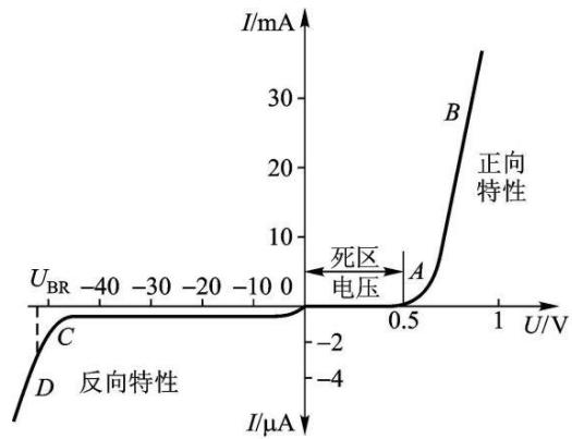 当不存在外加电压时,由于 P-N 结两边载流子浓度差引起的扩散电流和自建电场引起的漂移电流相等而处于电平衡状态,也就是图中的死区部分。当外界有正向电压偏置时,外界电场和自建电场的互相抑消作用使载流子的扩散电流增加引起了正向电流。当外界有反向电压偏置时,外界电场和自建电场进一步加强,形成在一定反向电压范围内与反向偏置电压值无关的反向饱和电流。