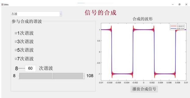 4)利用周期方波信号的各次谐波实现信号合成,记录合成波形并分析谐波对波形合成的影响;