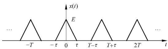 周期三角波信号如图 5所示。当 $\tau = \frac { T } { 2 }$ 时,按照类似的方法,可以得出其傅里叶级数展开式为: