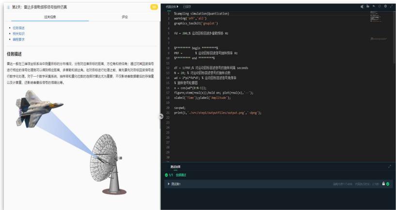 2)在头歌实践教学平台上开展闯关实训(名称:雷达多普勒频移信号的时域抽样实训),在规定时间内完成逐个通过各关卡,并根据完成情况自动计分。