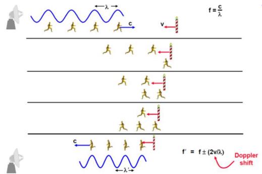 通过动画演示多普勒效应,目标和雷达的相对运动导致雷达发射和接收信号的频率发生变化,频率差正比于目标和雷达相对速度、反比于雷达波长。因此,测速的关键是获得发射和接收信号的频率差。