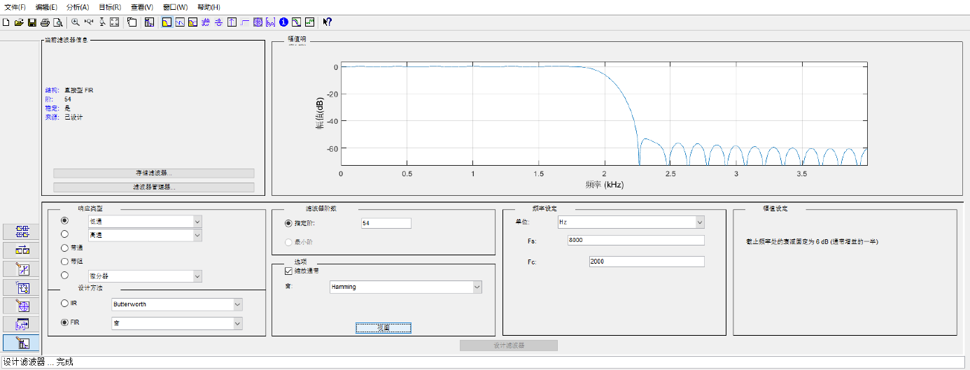 图12 设计截止频率为2000Hz的低通滤波器时相应的filterDesigner窗口