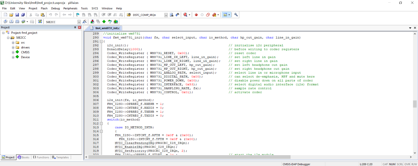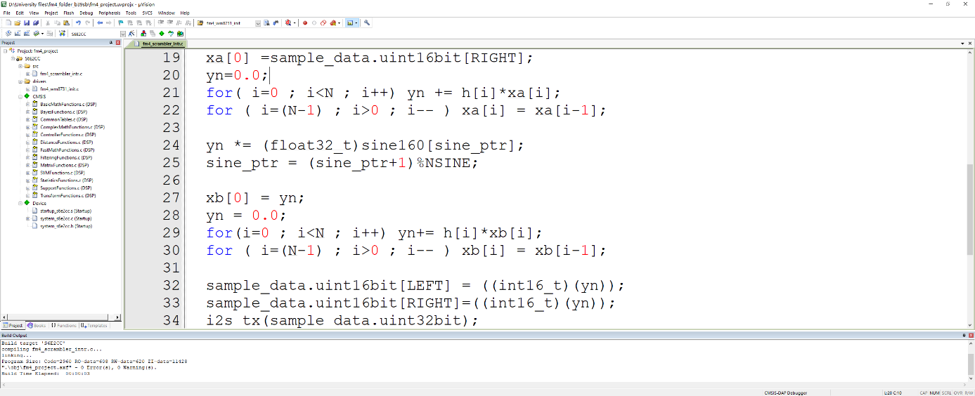 再使用Keil MDK-ARM编程工具,运行程序fm4_fir4tps_intr.c,通过开发板上的开关SW1改变滤波器的类型,实现四个81系数FIR滤波器,分别为:带宽为1500Hz的低通滤波器;带宽为2200Hz的高通滤波器;中心频率为1750Hz的带通滤波器;中心频率为790Hz的带阻滤波器。观察不同滤波器类型对音乐输入的影响。