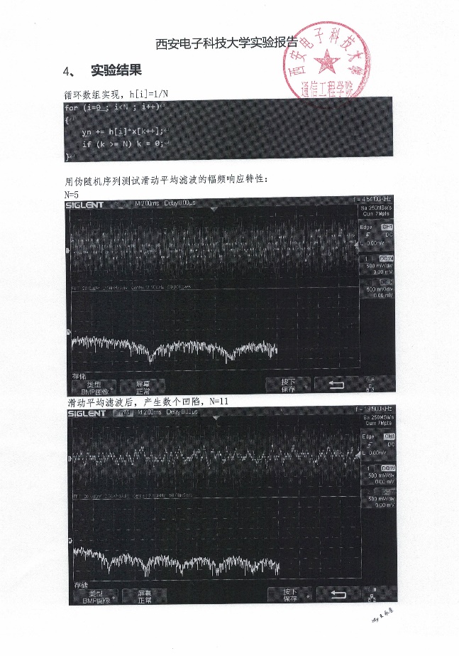 利用伪随机噪声作为输入信号,经过两个带阻滤波器后将输出信号接在示波器上,观察滤波器输出波形,可得到具有两个切口的带阻FIR滤波器幅频特性曲线。