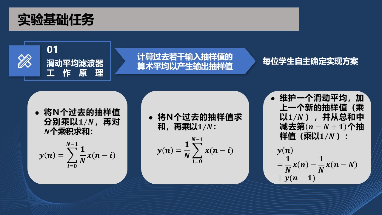 滑动平滑滤波器是在数字信号处理芯片中广泛使用的,也是最容易理解的一种滤波器。在消除信号中的高频噪声、平滑信号方面特别有效。滑动平滑滤波器的工作原理是计算过去若干输入抽样值的算术平均以产生输出抽样值,即滤波器系数$h(k)$恒等于$\frac{1}{N}$。就滤波器实现而言,在滤波器输出抽样值$y(n)$第$n$个抽样瞬间,有以下三种做法可供选择: