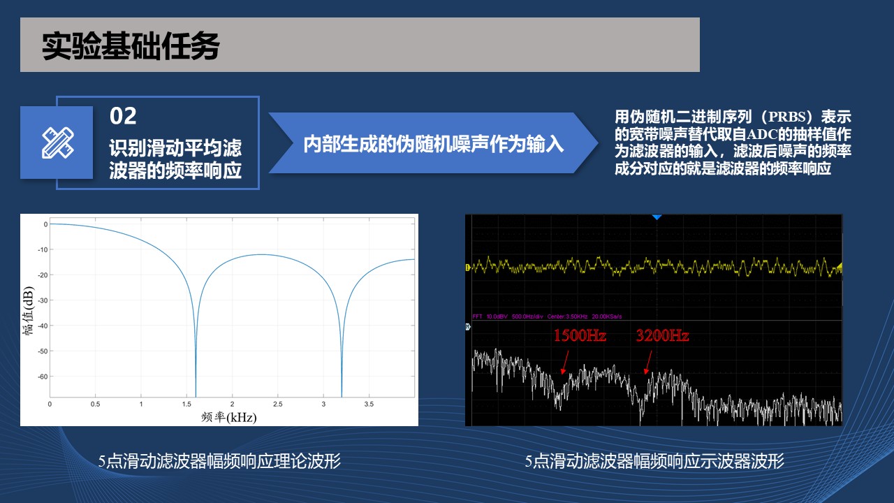 **识别:**利用Keil MDK-ARM编程工具,设置滑动平均滤波器的输入抽头个数,确定FIR数字滤波器实现方案,通过示波器观察滤波器的幅频响应特性;