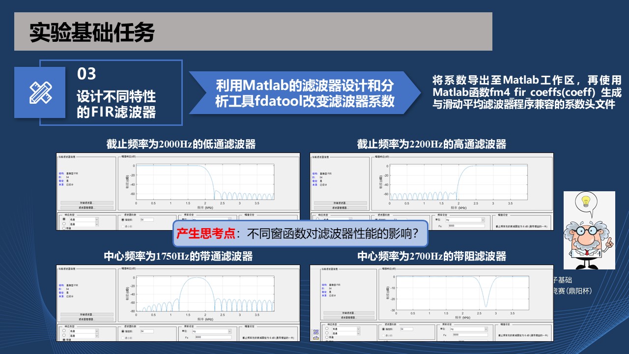 **设计:**使用Matlab生成FIR滤波器系数头文件,设计低通、高通、带通、带阻滤波器,观察音频信号通过不同种类FIR滤波器产生的效果,通过示波器观察滤波器前后音频信号波形图;