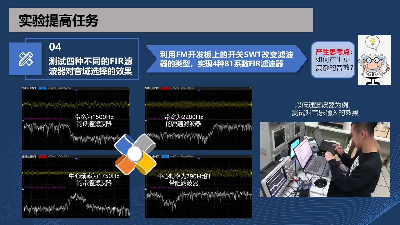 本实验案例针对以往学生对于课程内容理解不够深入、实践能力弱、学习主动性差、课程实验偏重于虚拟仿真缺乏挑战性等问题,着力打造“启发式、自主式、过程式”的实验教学设计思路。为学生提供满足信号处理实践教学的现代企业流行平台及相关开发技术,让学生自主设计FIR滤波器实时处理模拟音频信号,产生学习信号与系统课程需求,学生带着问题去学习,将所学的知识用于自主实践,在实践中切身体会所学课程的价值。此类教学设计思路是基于工程实践教学理念持续提升育人成效的重要且有效手段。