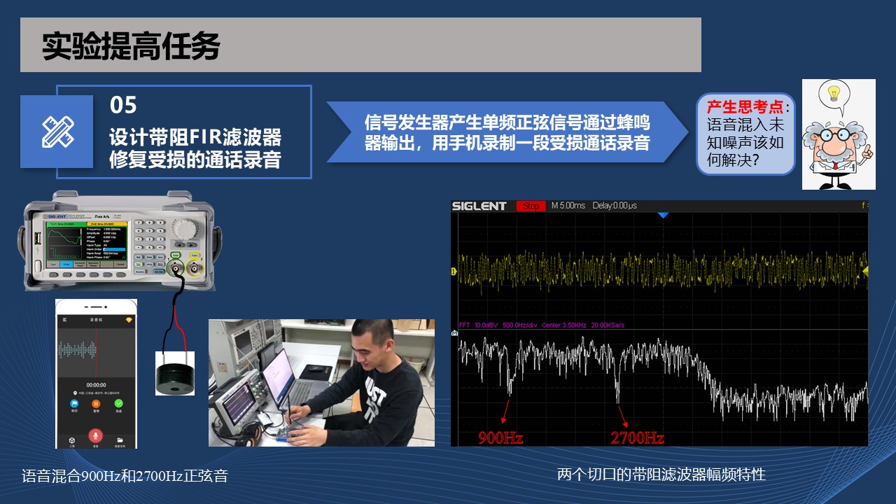 前面的实验让学生体验了音乐经不同FIR滤波器处理后的效果差异,接下来的实验需要现场对实时的语音通话进行录音,再掺杂两个不同频率的正弦音合成污损的语音信号,最后将合成信号通过两个级联的具有不同中心频率的带阻滤波器。