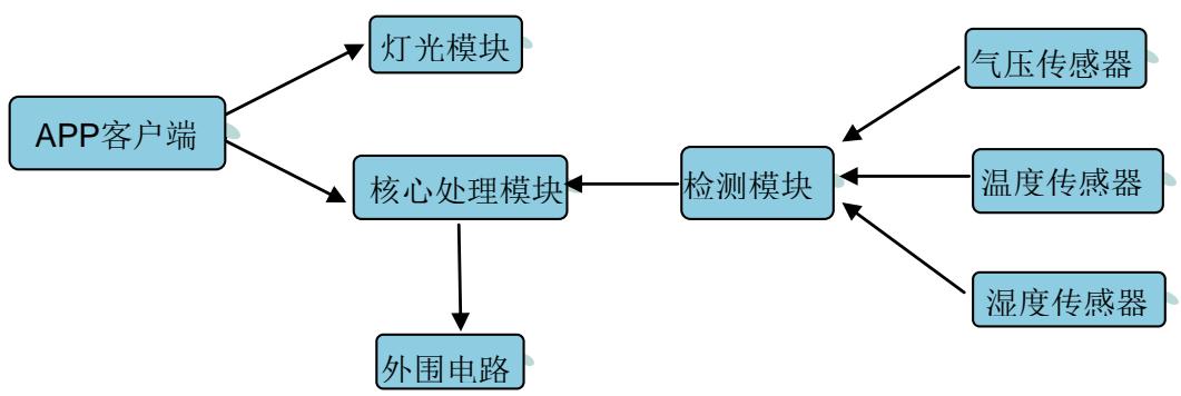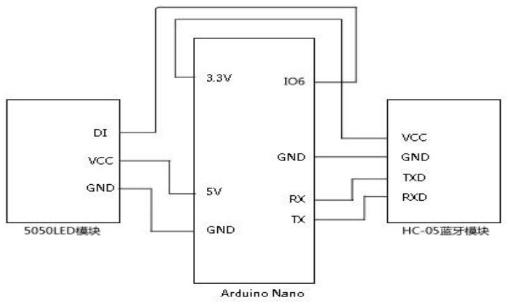 APP 端将取色盘上的 RGB 颜色及亮度条百分比转换为特定的数据流格式后(格式为(255,255,255,100),由蓝牙模块接收并输出给 Arduino Nano 单片机,再由 Arduino Nano 单片机分析处理后传输给5050全彩LED 模块进行显示,完成灯光模块的色彩及亮度调节。