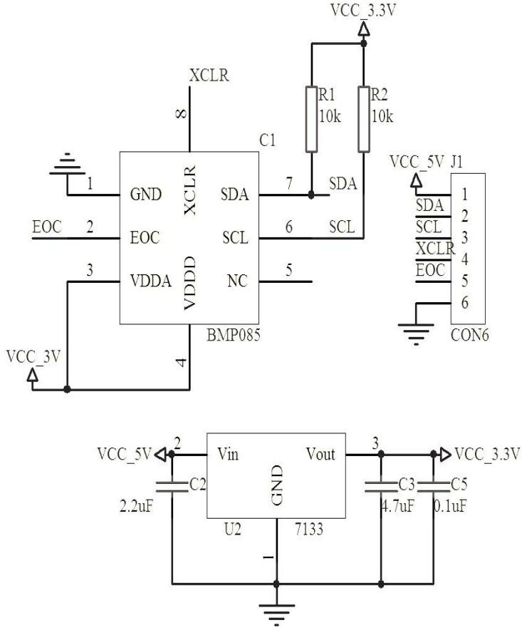 3、检测模块由DHT11温湿度传感器及BMP085气压传感器组成。DHT11数字温湿度传感器是一款含有已校准数字信号输出的温湿度复合传感器,它应用专用的数字模块采集技术和温湿度传感技术,确保产品具有极高的可靠性和卓越的长期稳定性。传感器包括一个电阻式感湿元件和一个 NTC测温元件,并与一个高性能 8 位单片机相连接,具有品质卓越、超快响应、抗干扰能力强、性价比极高等优点。BMP085 是一款高精度、超低能耗的压力传感器,它可以应用在移动设备中。它的性能卓越,绝对精度最低可以达到 $0 . 0 3 \mathrm { h P a }$ ,并且耗电极低,只有 3uA。BMP085 采用强大的 8-pin 陶瓷无引线芯片承载(LCC)超薄封装,可以通过 IIC 总线直接与各种微处理器相连。