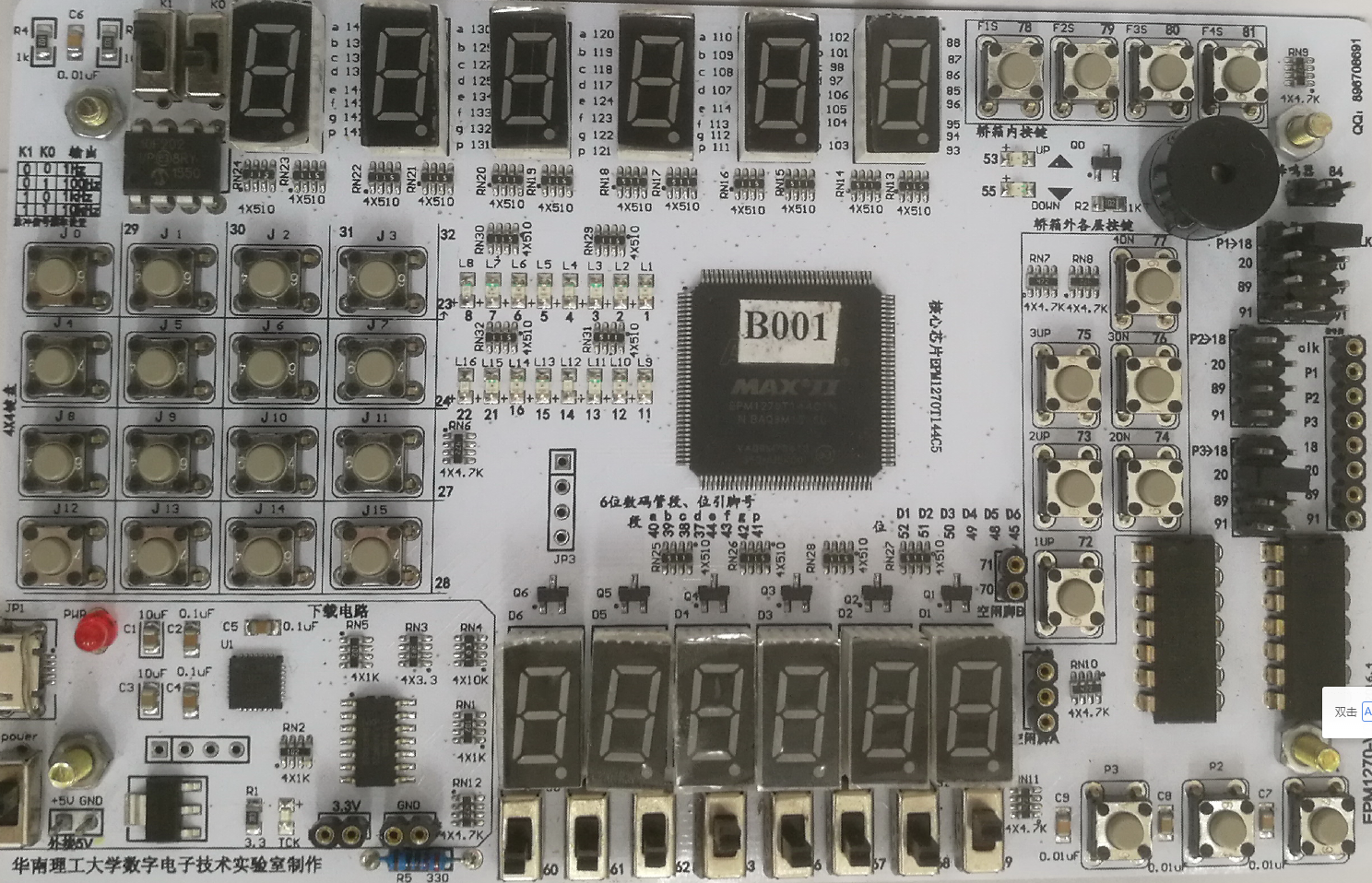 | 主要器件 | EPM1270T144C5、共阴数码管、LED、轻触开关、蜂鸣器 | ||||