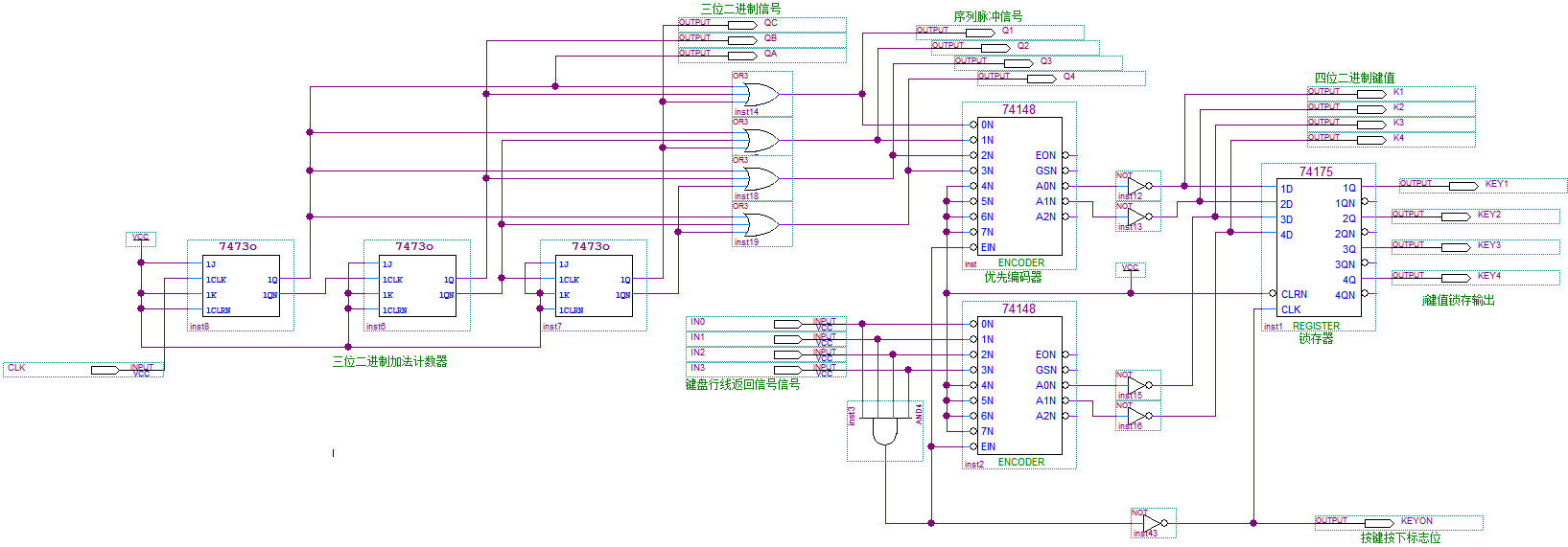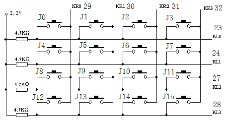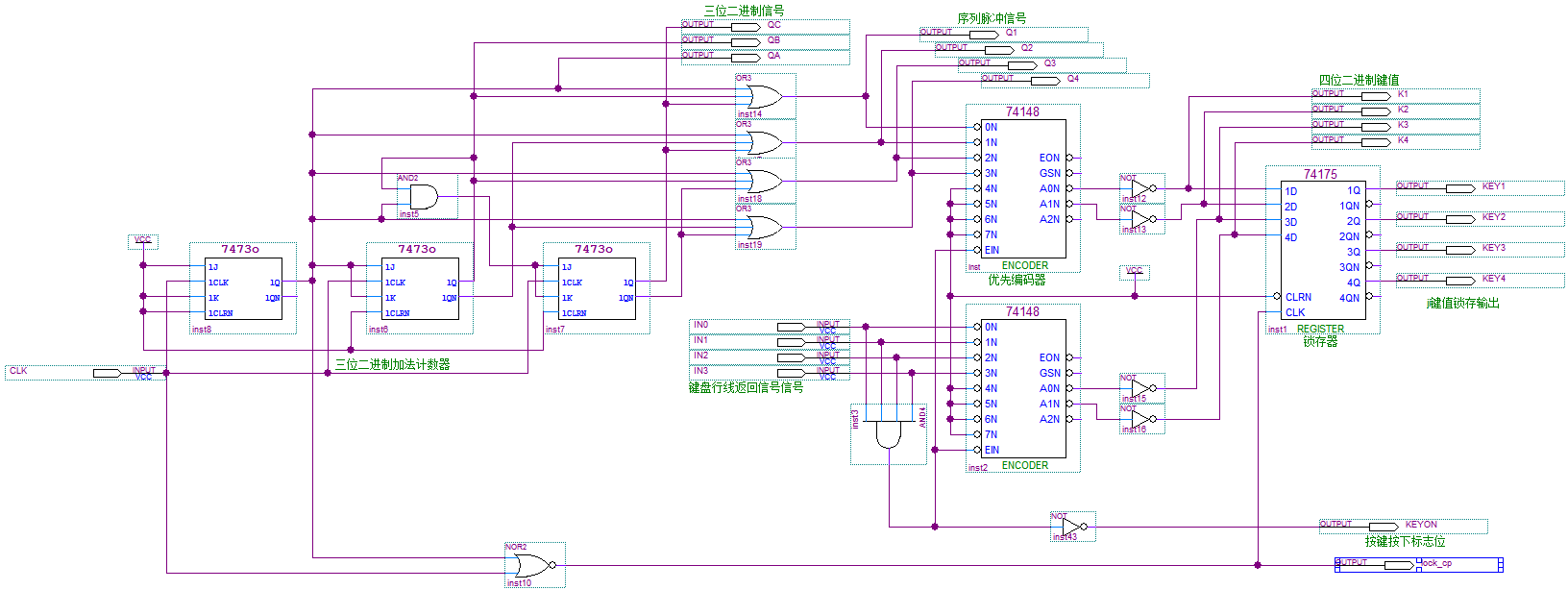 (2)4×4矩阵键盘扫描电路:对按下的按键进行识别、编码,输出4位二进制键值。