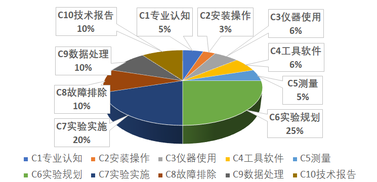 (1) 通过广泛调研,并会同产业界的企业家和工程师进行深入研讨,分解出实验教学的10项目标内涵;经过数据归纳和统计得出各项内涵对学生毕业后5年处理复杂工程问题能力的贡献率,见图2所示: