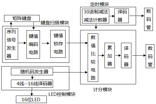 LED控制模块、倒计时模块、计分模块的设计、仿真、测试。(观测点:组合、时序逻辑电路的设计与调试)学生调试时,实验仪器的原始波形通过在线的实验教学管理系统提交作为评分依据之一。