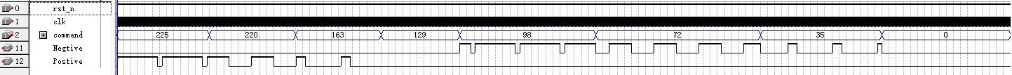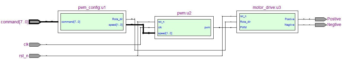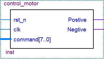 电机驱动control_moter模块的端口由系统时钟clk,系统复位rst_n和指令command三个输入端,电机驱动Postive和Negtive输出端构成。根据指令的功能与构成,首先在pwm_config模块里分离出转动方向Rota_dir信号和根据占空比得到的4各速度等级信号speed[1:0]信号;PWM模块根据speed信号等级在时钟信号clk和复位信号rst_n的控制下产生不同占空比的pwm信号;驱动motor_drive模块在Rota_dir方向信号的控制下,将pwm信号传递给postive或negtive电机驱动端,实现不同占空比的电机速度和转动方向控制。