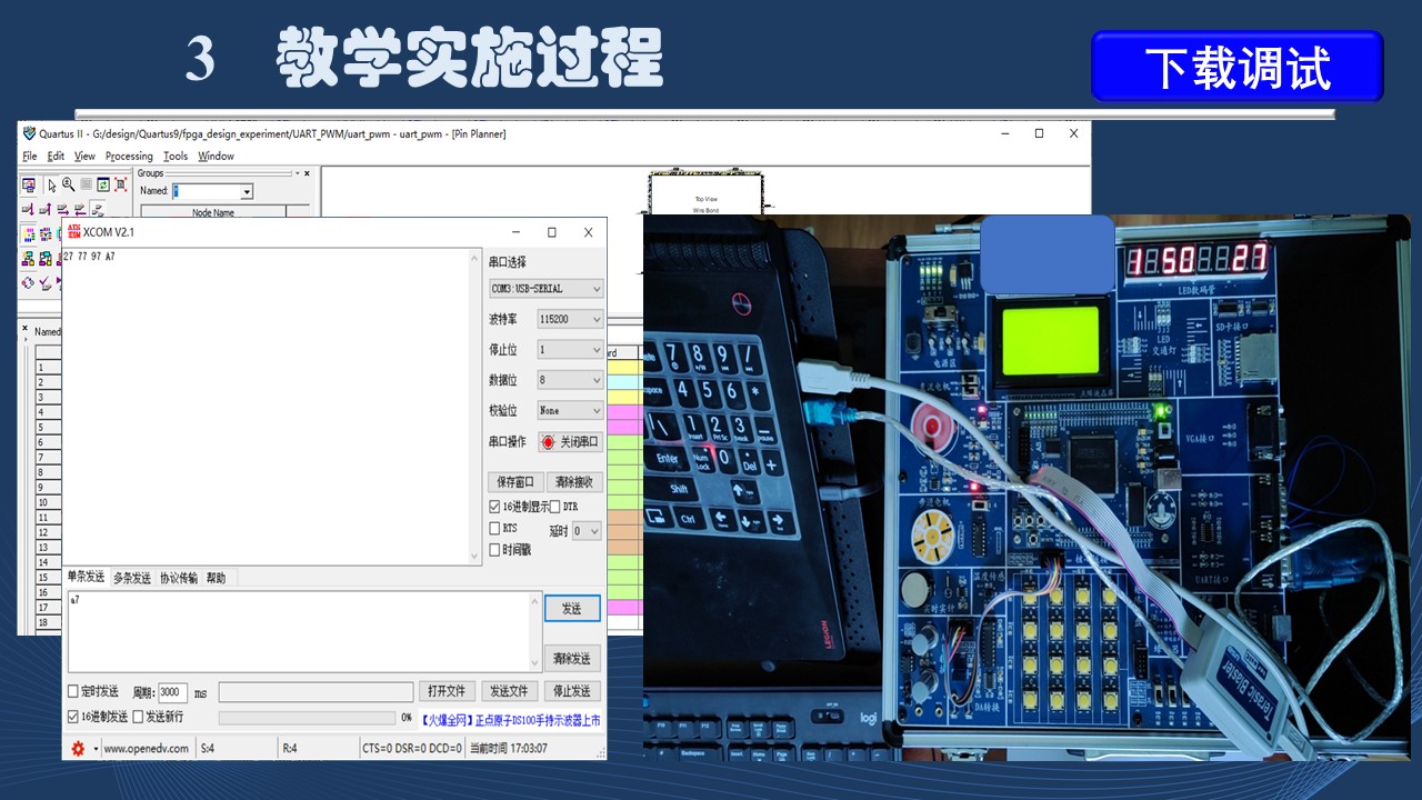 完成各功能模块的设计与仿真后,系统各模块的级联,管脚的映射,布局布线和编译,最后下载到实验平台进行验证。