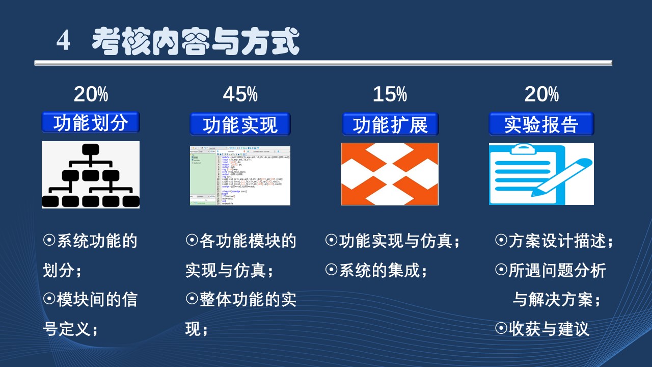 (2)功能实现:HDL编程良好的代码风格;在Quartus II或Modelsim对各层次功能模块进行较全面覆盖的仿真,实际测试功能正确;成绩占比45%。