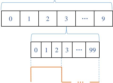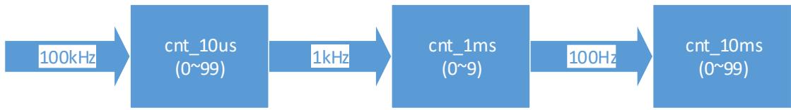 在设计过程中需要使用 3 个计数器 cnt_1ms、cnt_10ms 和 cnt_10us,其中计数器 cnt_10us 对周期是10us(频率为 100kHz)的时钟信号进行计数,计数范围是 $\boldsymbol { 0 } ^ { \sim } 9 9$ ,产生的进位信号使得计数器 cnt_1ms加 1;cnt_1ms 的计数范围是 0~9,产生的进位信号使得计数器 cnt_10ms 加 1;cnt_10ms 的计数范围是 0~99,实现 1 秒的点亮周期,计数过程如图 1 所示: