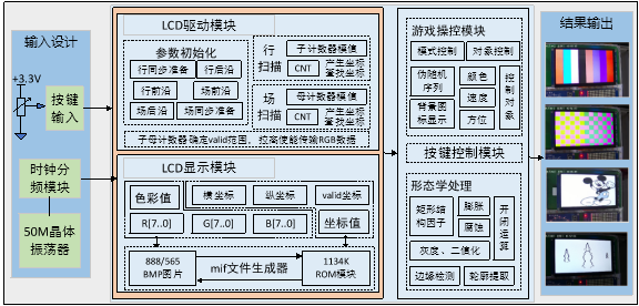 学生可利用原理图、硬件描述语言、宏模块等多种方法完成实验设计, LCD显示控制器系统包含:时钟分频模块、驱动模块、显示模块、按键控制模块、游戏界面控制模块、图像形态学处理模块等,其中,时钟分频模块负责产生像素时钟,LCD驱动模块产生同步信号,LCD显示模块输出图像数据。