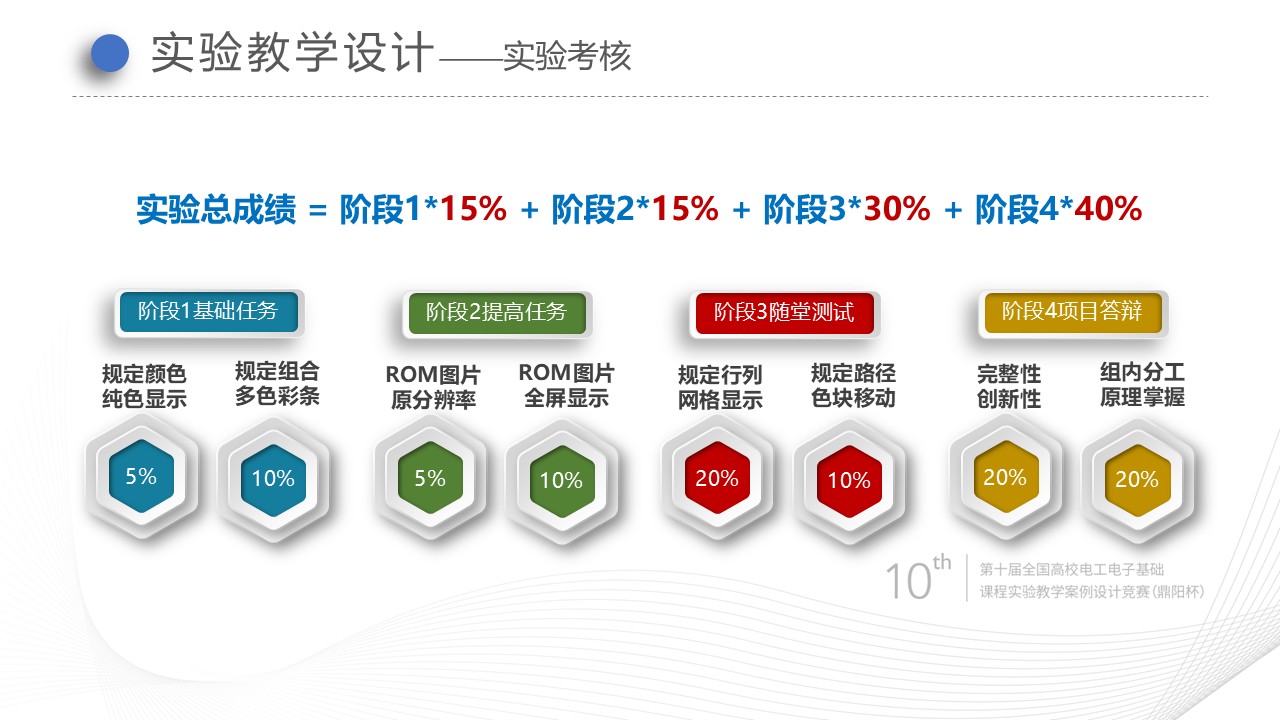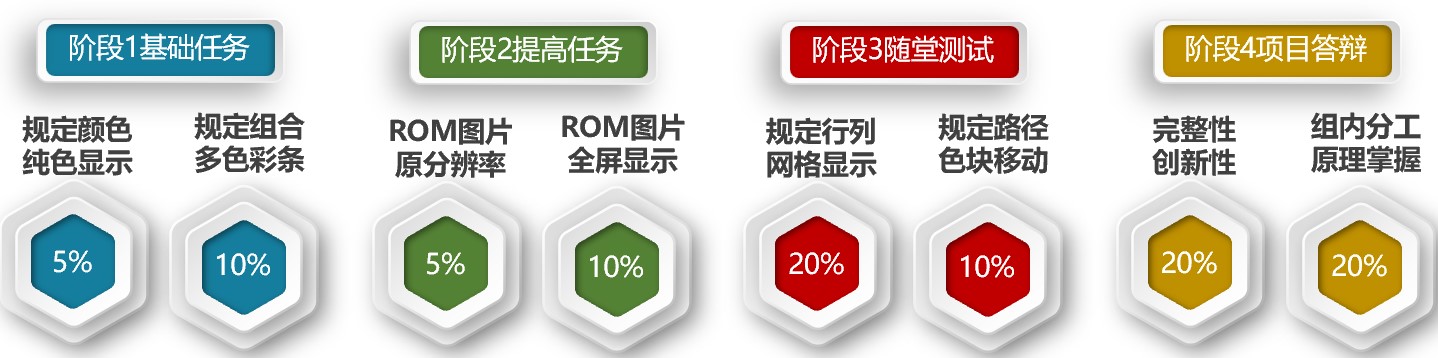 实验成绩= 基础任务*15% +提高任务*15% + 随堂测试*30%+ 项目答辩*40%