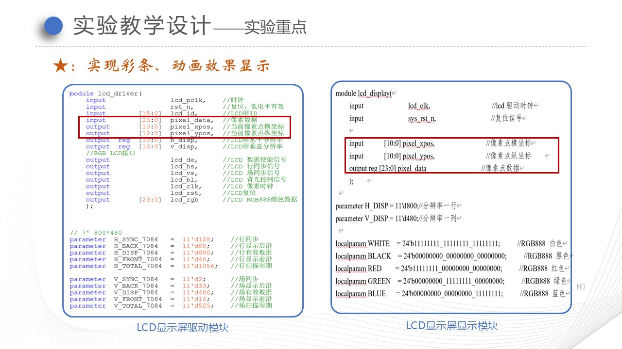 2)讲解LCD显示控制器的设计原理,对时钟模块、显示模块、驱动模块设计中涉及的实验难点,采用研讨式教学,让学生分组讨论;