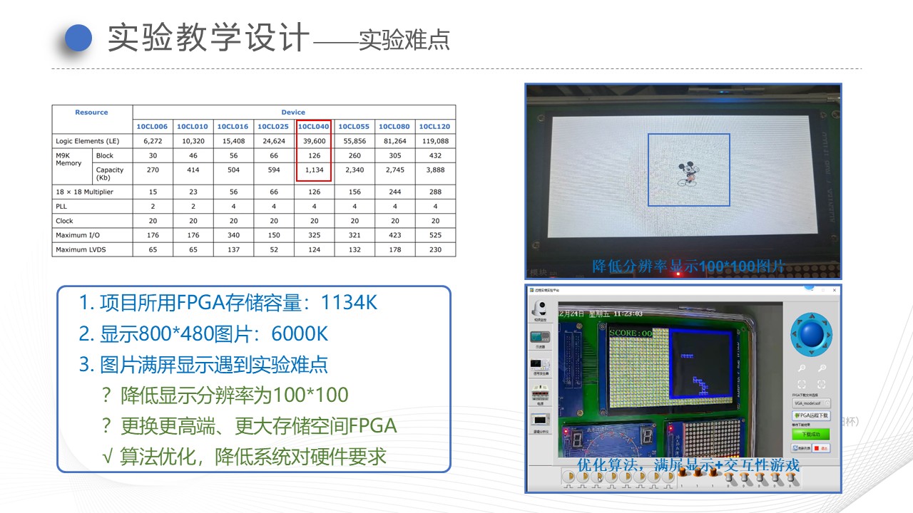 **学生只调用FPGA内置的RAM模块(存储空间为1134K),不使用SDRAM和SD卡等外部存储资源,**在LCD显示屏上实现图片、彩条、文字等内容显示,并完成具有交互性强、趣味性高的游戏界面设计。