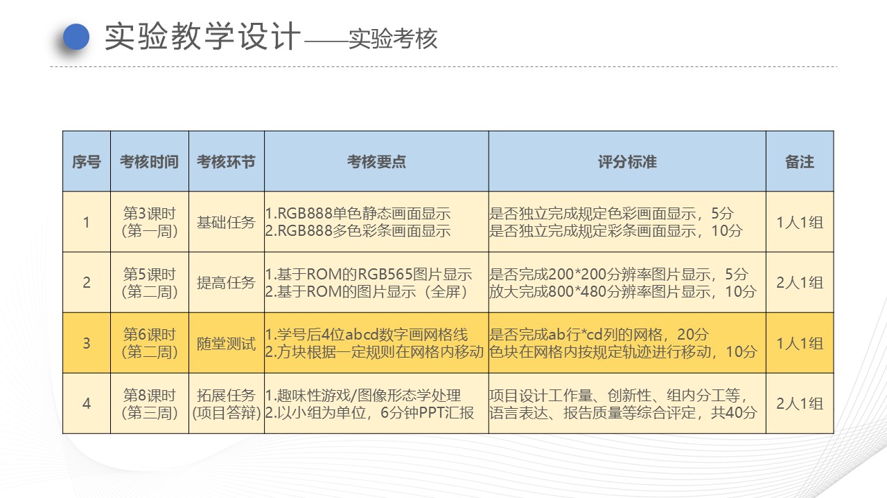 实验项目对学生的考核主要体现在“参与性、要点总结、实验拓展、文档资料表述”等方面。实验课内学时为8个课时数,第3课时进行基础实验任务验收,第5课时进行提高实验任务验收,第6课时进行随堂测试,第7、8课时组织同学进行项目汇报答辩。