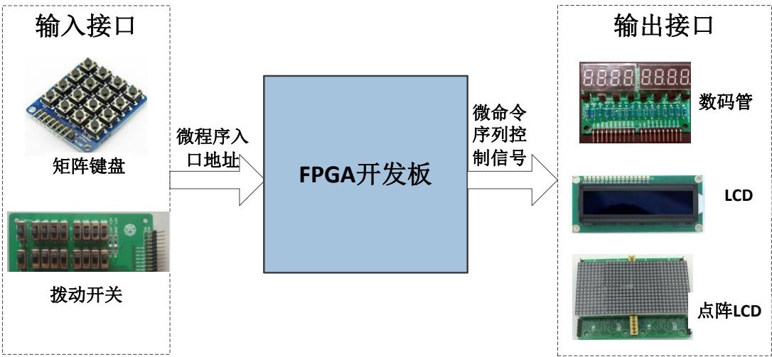 采用硬件描述语言设计微程序控制器功能模块,经仿真验证后下载到FPGA 开发板进行板级验证。在基于FPGA开发板基础上进行输入和输出接口电路设计。输入接口可采用拨动开关、矩阵键盘或并行接口键盘,实现机器指令操作码的输入。输出接口可采用并行或串行数码管、并行/串行字符型LCD或点阵LCD,实现微命令序列控制信号的显示。