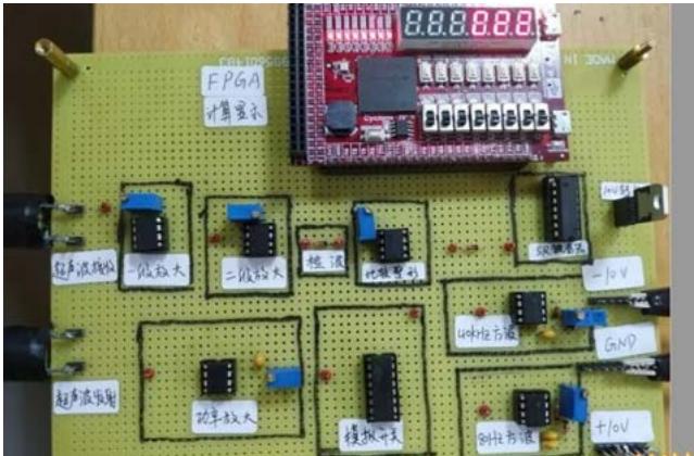 | 主要器件 | FPGA模块、超声传感器、555振荡器、功率放大器、放大器、数码管 | |||||
