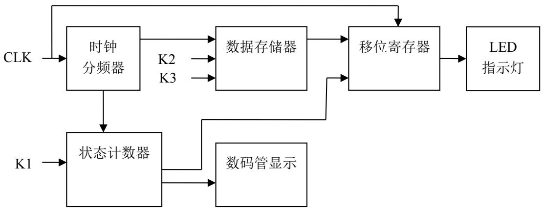 首先,在 ED2 实验装置上有两个时钟源,通过特定的硬件引入到了 FPGA 芯片内部,时钟频率分别是 50MHz 和 $2 7 \mathrm { M H z }$ ,显然这两个频率太高了,导致周期太小,由于人眼睛的视觉暂留现象,使得人眼是无法看到 LED灯的闪亮状况,因此要对其进行分频。在设计过程中,可以任选一个时钟频率,将其分频到 100HZ以下的任一频率,已适合观看为准。分频电路分出几个适合观察的频率,送入一个数据选择器,把 K2和 K3键接至数据存储器的选通端,来控制送入哪个频率的时钟数据送入到移位寄存器的数据输入端。数据存储器可以由数据选择器构成。