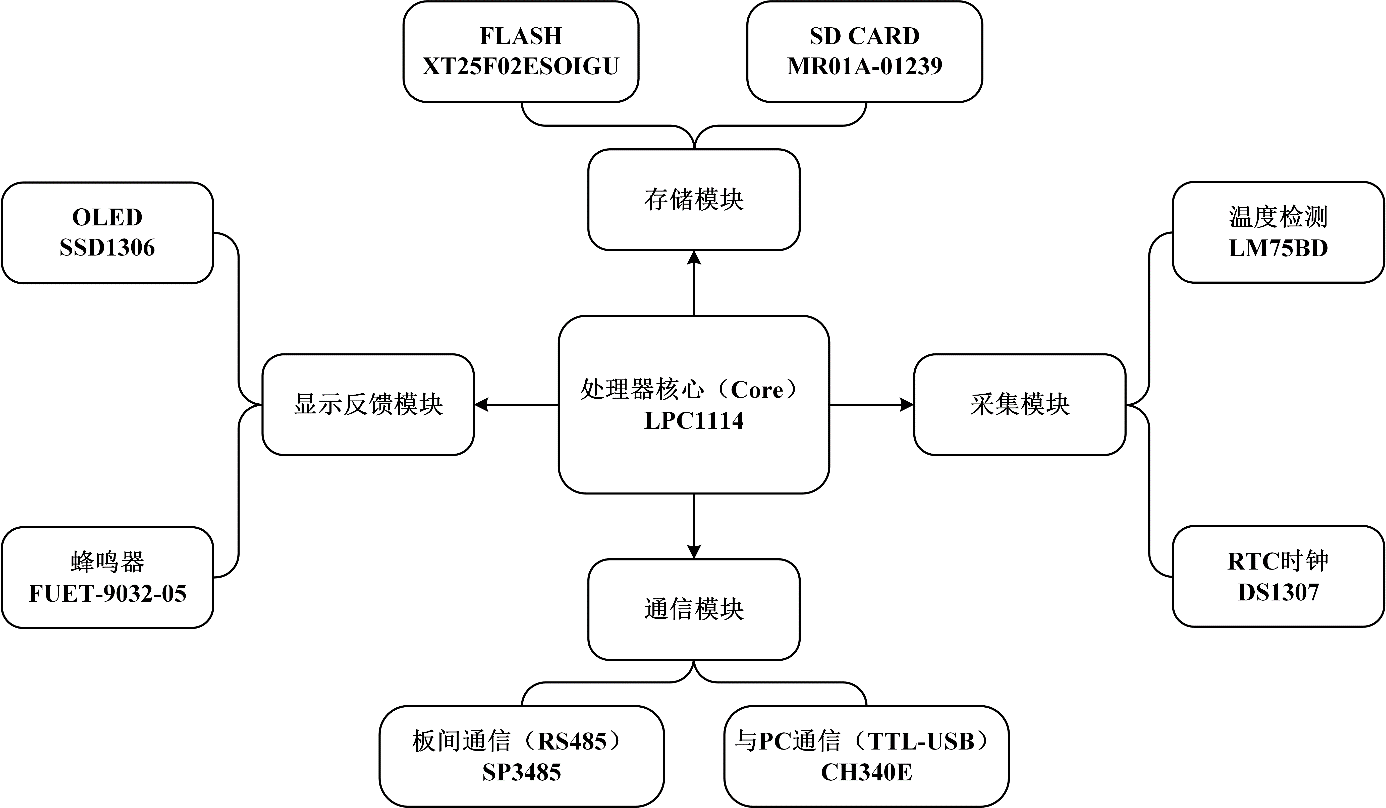 以LPC1114为处理器,按照功能将总体电路分为采集模块、通信模块、显示反馈模块和存储模块四大模块,模块框图如图1所示。其余如降压模块、调试模块等与功能实现并不与温度监控系统直接相关所以未在此处列出。