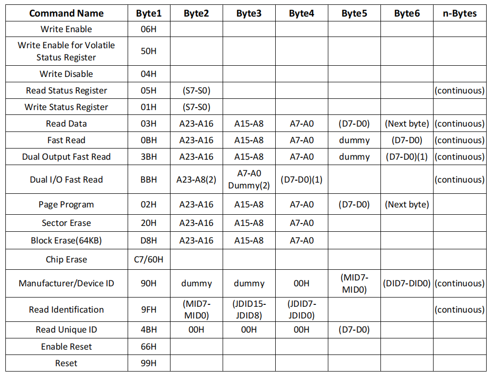 读取数据字节(Read)命令后面是一个3字节地址(A23-A0),每个位在SCLK的上升沿期间被锁定。然后,在该地址的内存内容在SO上移出,在SCLK的下降沿期间,每个位以最大频率𝑓