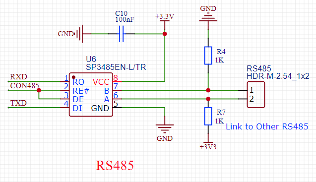 RS-485是一种常用的串行通信标准,用于在工业控制系统、自动化设备和数据采集系统中实现设备之间的远距离通信。RS-485通信协议基于差分信号传输,具有高抗干扰性和远距离传输能力,使其在工业环境中得到广泛应用。使用SP3485芯片作为RS485通信芯片,如图5所示。通过485总线进行板间通信,主要为传递报警信息。当某一温度检测点处温度超出预警值,相连接的设备会接收到来自该板的预警信息,并且将报警信息显示在OLED上,实现多点的监测联动。