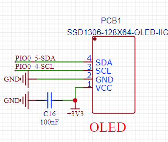 OLED由I2C总线驱动,使用有SDA、SCL、GND以及VCC的4 pin的OLED屏幕,型号为SSD1306,电路如图7所示。