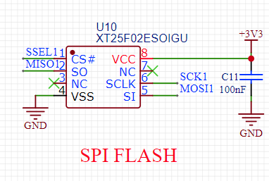 存储模块中分为FLASH和TF卡两个存储器,两者均使用SPI协议进行读写。其中FLASH芯片使用SSP1,TF卡使用SSP0。FLASH型号为XT25F02E,存储电路如图9所示。
