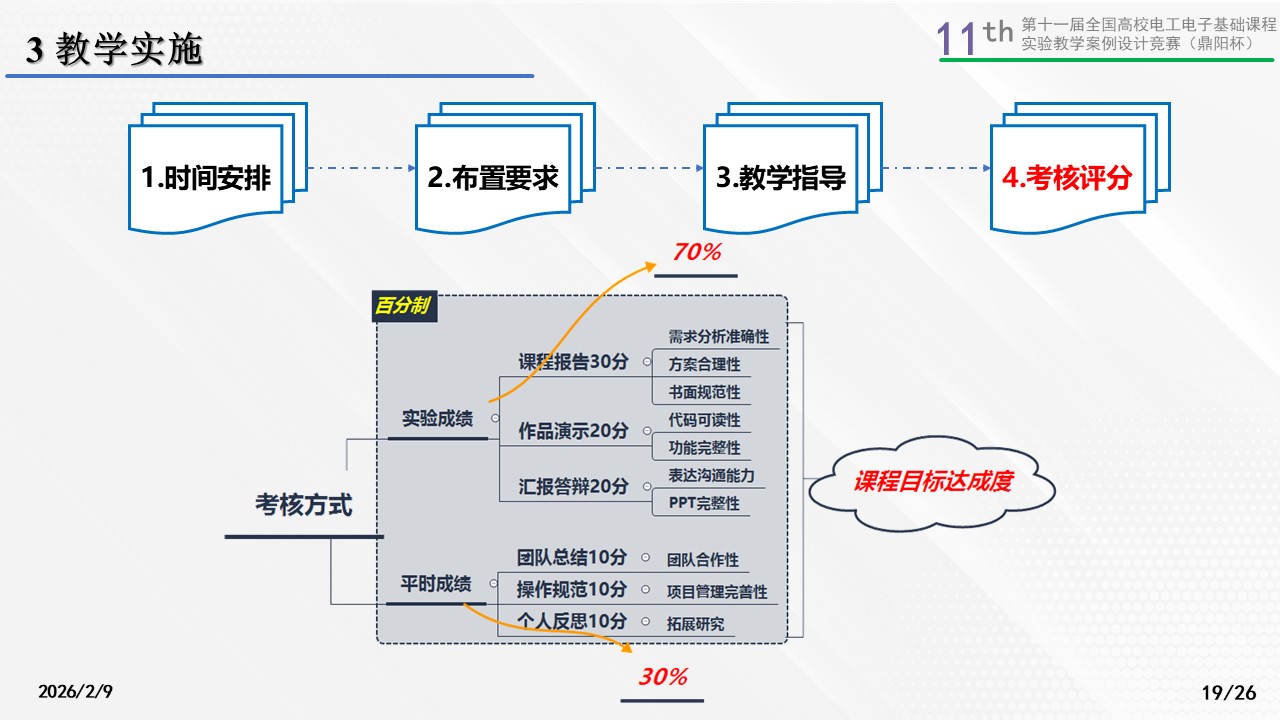 本课程最终通过多维度考核方式。总成绩由平时成绩(团队总结、操作规范、个人反思)和实验成绩(课程报告、作品演示、汇报答辩)组成,平时成绩占30%,实验成绩占70%。