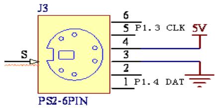 单片机通过PS/2协议获取鼠标移动向量,在液晶上实现精确定位。不仅能够实现菜单选择,还能够完成每个图形像素点的坐标定位,输出对应点的参数值。PS/2鼠标接口采用一种双向同步串行协议,由单片机控制鼠标的 CLOCK 和 DATA 端子。鼠标与单片机之间传送数据,鼠标的 CLOCK 接主机的外中断,鼠标的 DATA 接 UART 的接收脚 RxD 。在初始化过程中,单片机利用 CLOCK 的外中断和 RxD脚的 $\mathrm { I } / 0$ 口实现数据的传输。初始化完成后,切换到RxD功能即 UART的接收引脚功能,将鼠标设定为Stream模式的工作状态,实现主动发送数据。其电路如图3所示。