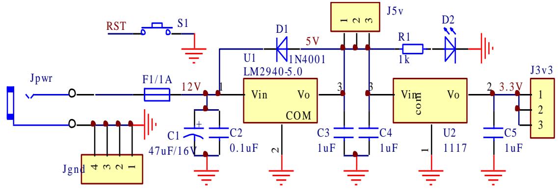 测试系统采用 12V 电源供电,由于液晶模块需要 5V 供电,而单片机需要 3.3V 供电,因此需要设计电源电路来提供两个电压值,电源电路如图 4 所示。