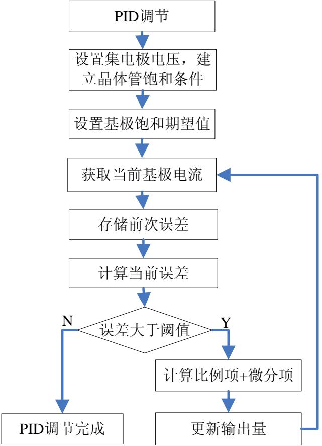 通过 PID 算法控制每根采样线的基极饱和电流值。在采样开始时,先设置一个带有裕量的集电极电压值提供足够的集电极电流使晶体管达到饱和状态,然后调用 PID 控制子程序,调节基极电流达到期望值。需要说明的是,算法使用的是离散PID算法,即以一系列的采样时刻点kT代表连续时间 t,以矩形法数值积分(和式)近似代替积分,以一阶向后差分(增量)近似代替微分。其程序流程图如图6所示。