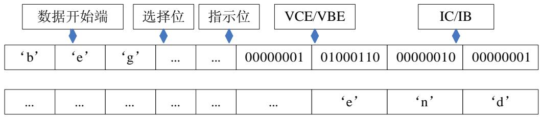 数据以字符串”beg”开始,然后是输入输出选择位,上位机根据此位判别测量模式,随后的是晶体管指示位,指示当前所测的晶体管是二极管、PNP 或 NPN 三极管还是场效应管。然后便开始了